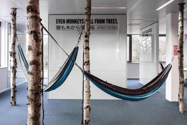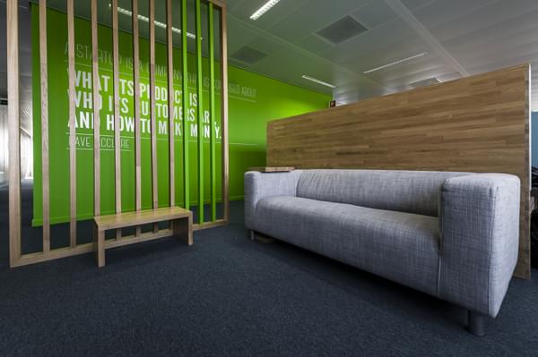 用一個長長的布藝沙發外加一個簡單的實木茶幾就實現了簡簡單單的前臺接待區空間布局,Nest用案例告訴我們,其實前臺接待區沒有必要搞得那么莊重,這種簡單時尚的氛圍反而會讓我們的客戶有一種輕松的感覺。